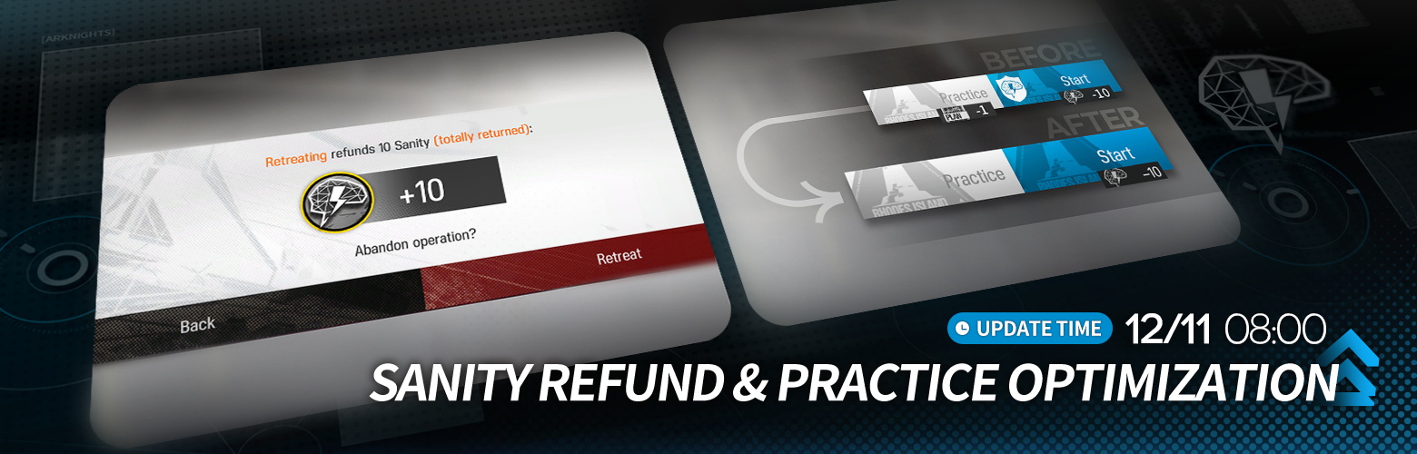 DETAILS: After the update on December 11, 2025, 08:00 (UTC-7), Sanity Refund and the Practice mode will be optimized. Regardless of whether it is the first time a stage is attempted, if a battle fails or an operation is abandoned, all Sanity consumed will be fully refunded. In addition, Practice Drill will no longer consume Drill Plan and will become an unlimited-use feature.