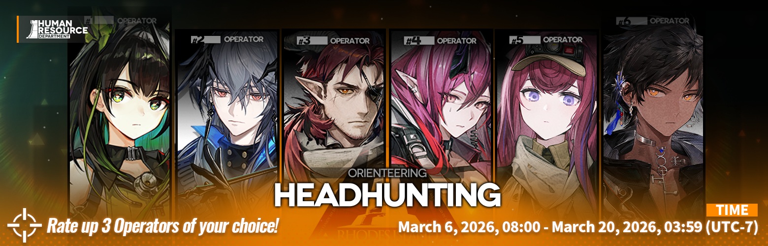 DETAILS: During the Orienteering Headhunting, you can select and lock in three 6-star and three 5-star Operators of this pool and raise their rates. The three selected 6-star Operators will be the only 6-star Operators in this headhunting.