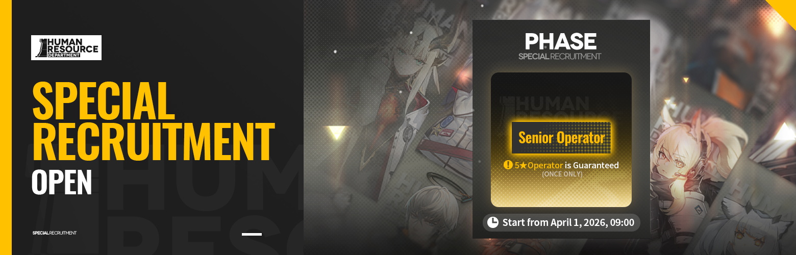 DETAILS: During the event, Special Recruitment will refresh the Job Tags that include the corresponding tags. Senior Operator tag is guaranteed to appear during event (once only). By completing the recruitment with the Senior Operator tag in this period, you can obtain one 5★ Operator (limited to Operators available from Recruit).